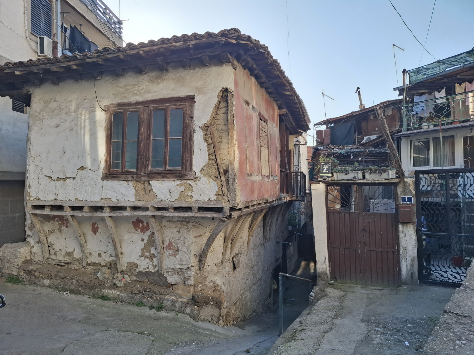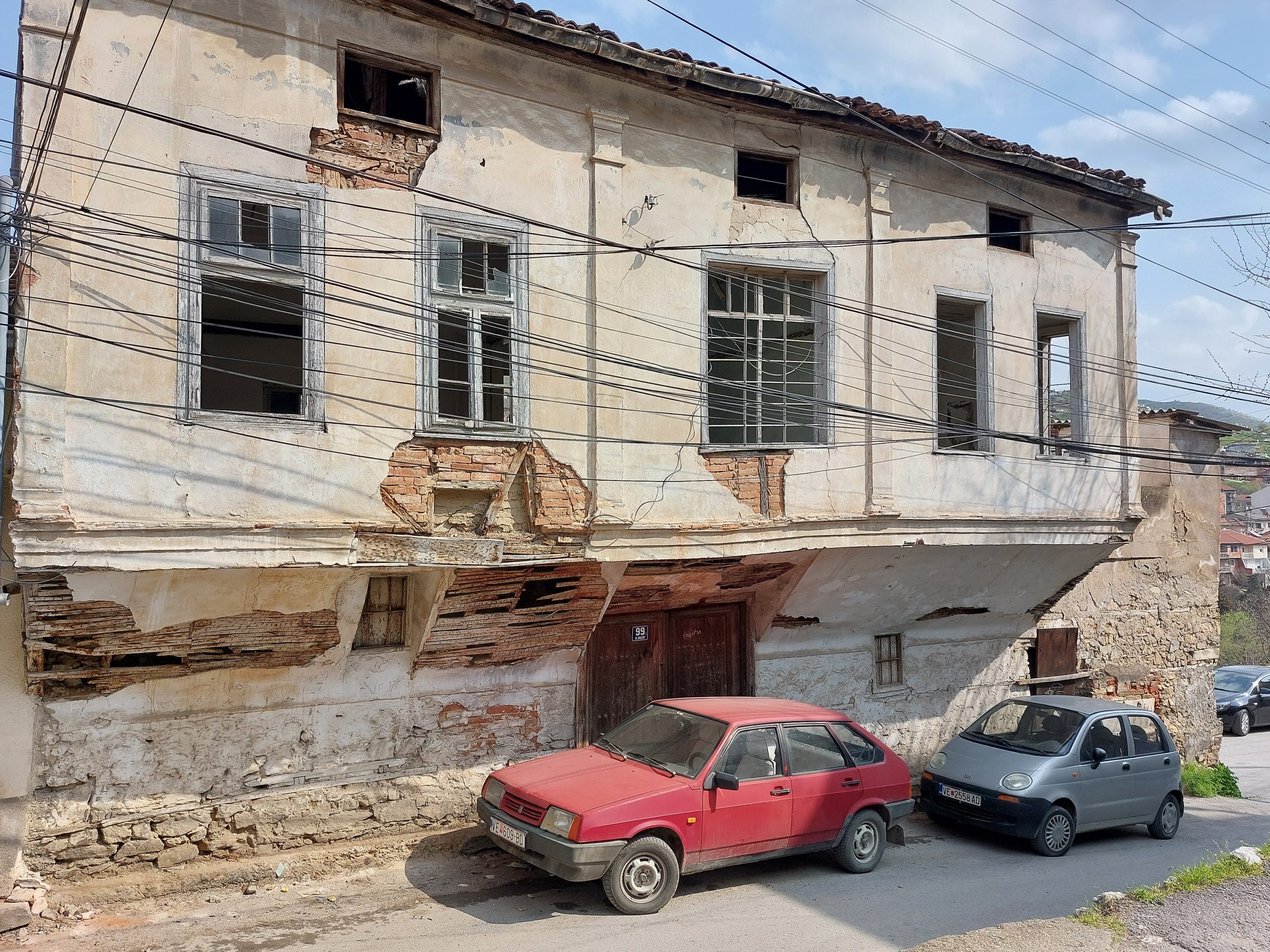 Погледот однадвор кон двата ката во висина и кон покривот на оваа куќа доловува глетка на дограма или на дрвени прозорци во распаѓање со искршени стакла, искривена влезна порта на која повеќе ги нема украсните клавоси и орнаментираното метално чукало. Качувањето по првите неколку дрвените скали од тремот кон првиот кат остави впечаток на ризик што дополнително го потврдија извикнувањата на соседите „не се качувај, не се знае колку се безбедни!“